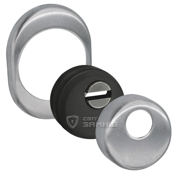 Для монтажа по диаметру протектора делается отверстие в дверном полотне. Крепится вокруг сердцевины стяжными винтами, создавая монолитную конструкцию с ней. Таким образом, протектор защищает ее вместе с точкой крепления в дверях от физических и силовых методов взлома - сверления, взлома и выбивания. Доступа к винтам крепления нет и сорвать саму броненакладку чрезвычайно сложно. Высота (или толщина) ее составляет 26,5 мм, диаметр - 50 мм. В цвете "матовый хром" лучше будет дополнять двери светлых оттенков - от тепло-серых до бежевых.