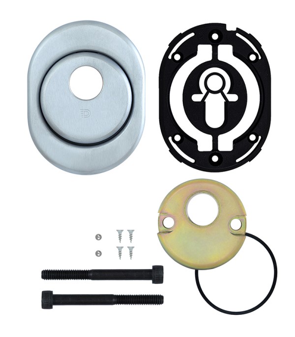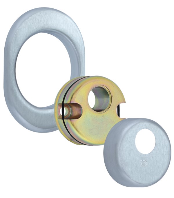 Монтируется врезным методом: по его диаметру делается отверстие в дверном полотне. Крепится сквозь вокруг сердцевины стяжными винтами М6 с технологией Flex. Ее суть заключается в более мелкой резьбе и определенной насечке. Благодаря этому и специальному виду жесткой стали винты выдерживают нагрузку в 5 раз больше, чем обычные. Так они создают монолитную конструкцию с сердцевиной. Высота (или толщина) протектора составляет 21 мм, диаметр - 50 мм. Протектор для внешней стороны двери выбирается отдельно. В цвете “хром матовый” лучше будет дополнять двери светлых оттенков - от тепло-серых до бежевых.