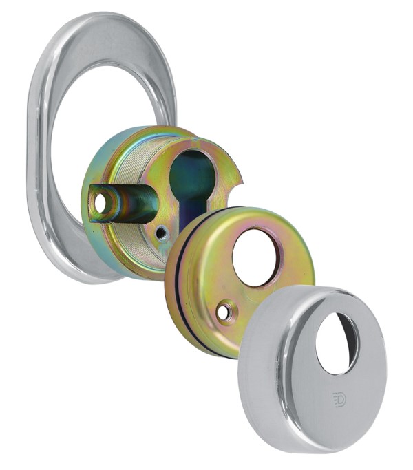 Монтируется врезным методом: по его диаметру делается отверстие в дверном полотне. Крепится сквозь вокруг сердцевины стяжными винтами М6 с технологией Flex. Ее суть заключается в более мелкой резьбе и определенной насечке. Благодаря этому и специальному виду жесткой стали винты выдерживают нагрузку в 5 раз больше, чем обычные. Так они создают монолитную конструкцию с сердцевиной. Протектор для внешней стороны двери выбирается отдельно. В цвете “хром полированный” лучше будет дополнять двери светлых оттенков - от тепло-серых до бежевых.