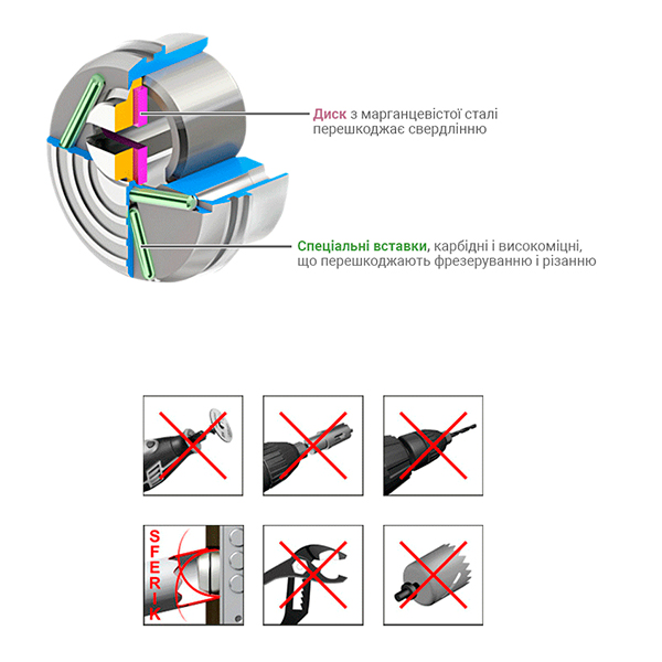 • Имеет рифленую поверхность лицевой стороны – защиту от применения фрез для высверливания.