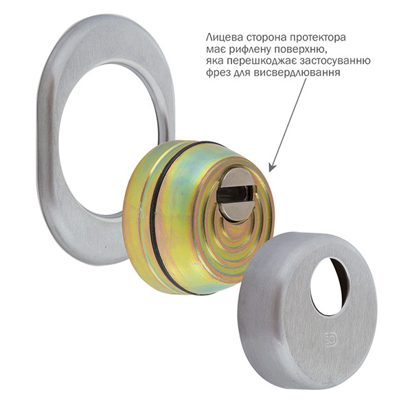 Монтируется врезным способом: по его диаметру делается отверстие в дверном полотне. Крепится насквозь вокруг сердцевины стяжными винтами М6 с технологией Flex. Ее суть заключается в более мелкой резьбе и специальной насечке. Благодаря этому и специальному виду жесткой стали винты выдерживают нагрузку в 5 раз больше, чем обычные. Так они создают монолитную конструкцию с сердцевиной. Таким образом, протектор защищает ее вместе с точкой крепления в дверях от физических и силовых методов взлома – сверление, выламывание и выбивание. Доступа к винтам крепления нет и сорвать саму броненакладку очень трудно. Также вкручивается в усиленную наружную "юбку".