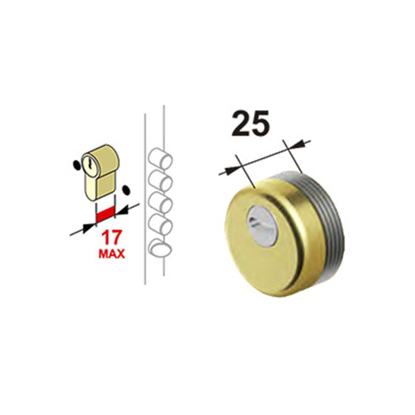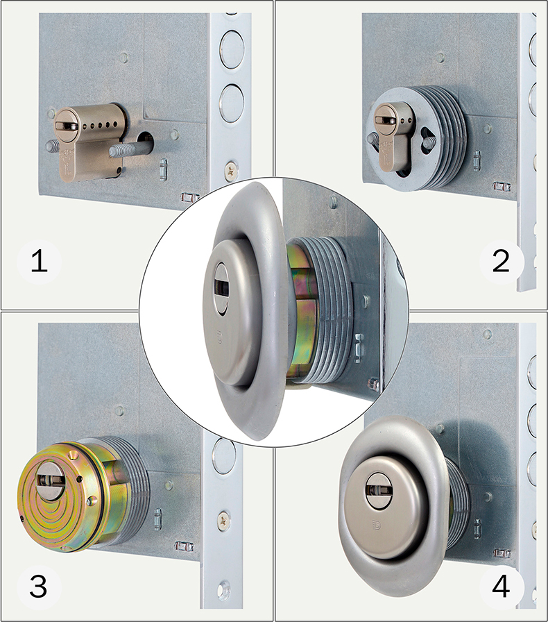 Монтируется врезным способом: по его диаметру делается отверстие в дверном полотне. Крепится насквозь вокруг сердцевины стяжными винтами М6 с технологией Flex. Ее суть заключается в более мелкой резьбе и специальной насечке. Благодаря этому и специальному виду жесткой стали винты выдерживают нагрузку в 5 раз больше, чем обычные. Так они создают монолитную конструкцию с сердцевиной. Таким образом, протектор защищает ее вместе с точкой крепления в дверях от физических и силовых методов взлома – сверление, выламывание и выбивание. Для дополнительной защиты от сверления в крепежные отверстия устанавливаются закаленные шарики (входят в стандартный комплект). Доступа к винтам крепления нет и сорвать саму броненакладку очень трудно.