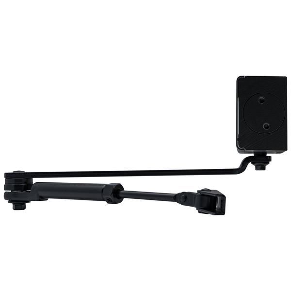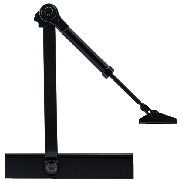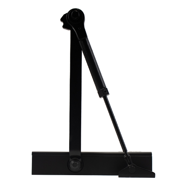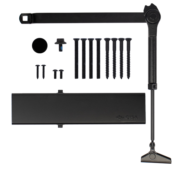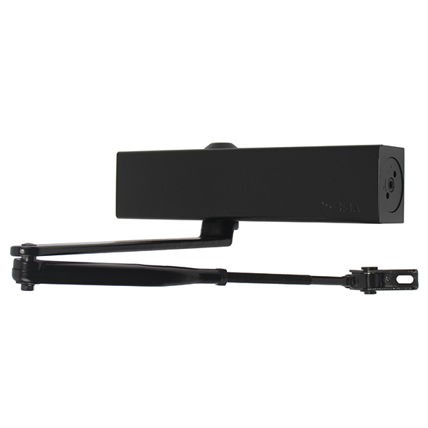 Сила закрывания в пределах EN 2-4 регулируется путем изменения позиции корпуса доводчика и тяги. В данной комплектации предусмотрена стандартная тяга, позволяющая зафиксировать дверь в открытом положении под углом до 130°. Это удобное решение, которое обеспечивает возможность покидать дверь открытой, например, для проветривания помещения или создания комфортных условий при использовании в коммерческих объектах.