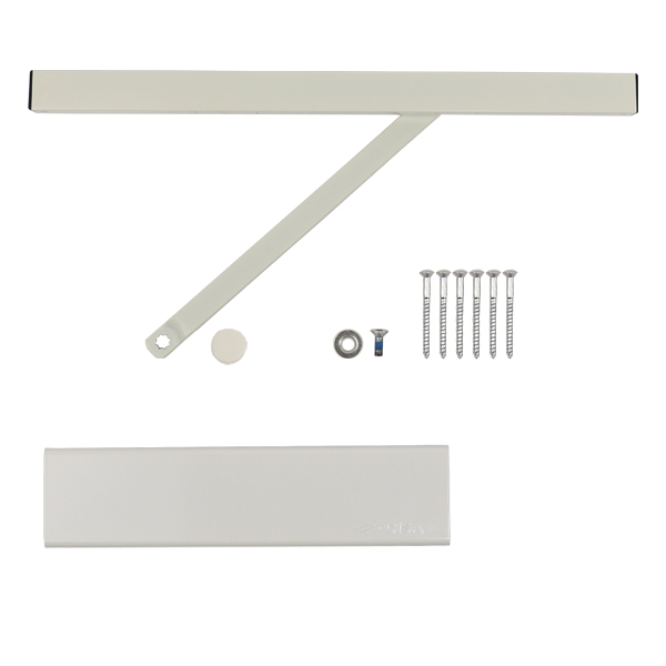 Комплектация включает скользящую тягу без функции фиксации дверного полотна в открытом положении. В то же время этот доводчик сертифицирован для использования с противопожарной дверью, что делает его оптимальным выбором для обеспечения безопасности в помещениях с высокими требованиями к пожарной стойкости.