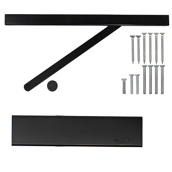 Сила закрывания регулируется в пределах EN 1-4 с помощью винта, расположенного сбоку корпуса. Комплектация включает скользящую тягу, позволяющую зафиксировать дверь в открытом положении. Это удобное решение, которое обеспечивает возможность покидать дверь открытой, например, для проветривания помещения или создания комфортных условий при использовании в коммерческих объектах.