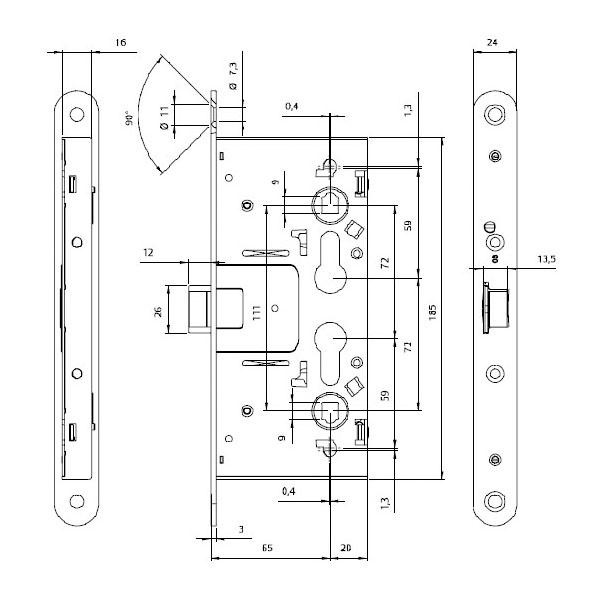 Механическая функция: при закрытии замка снаружи DIN-цилиндром, внешняя поворотная ручка деактивируется – дверь снаружи блокируется.