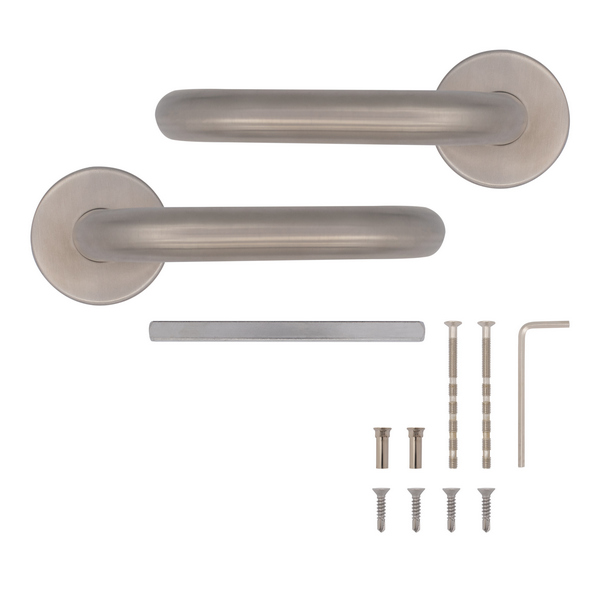 Ручки изготовлены из нержавеющей стали, что позволяет использовать их при различных погодных условиях. Они достаточно крепкие и износостойкие. Эргономичная форма нажимной части и матовая поверхность обеспечивают удобство повседневного использования. Округлый дизайн в цвете матовой нержавеющей стали лучше подходит для общественных мест или офисов с большим потоком людей.