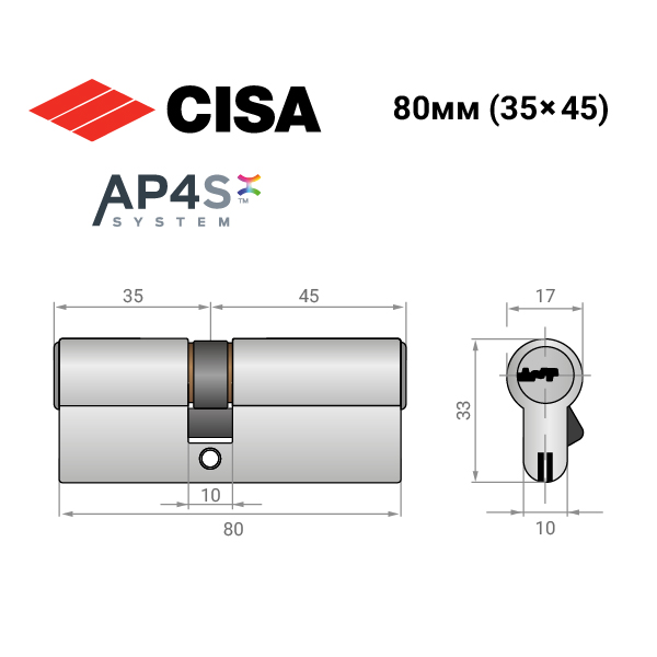 - Цилиндр CISA AP4 S 80 (35*45) никель матовый 3 ключа ⭐