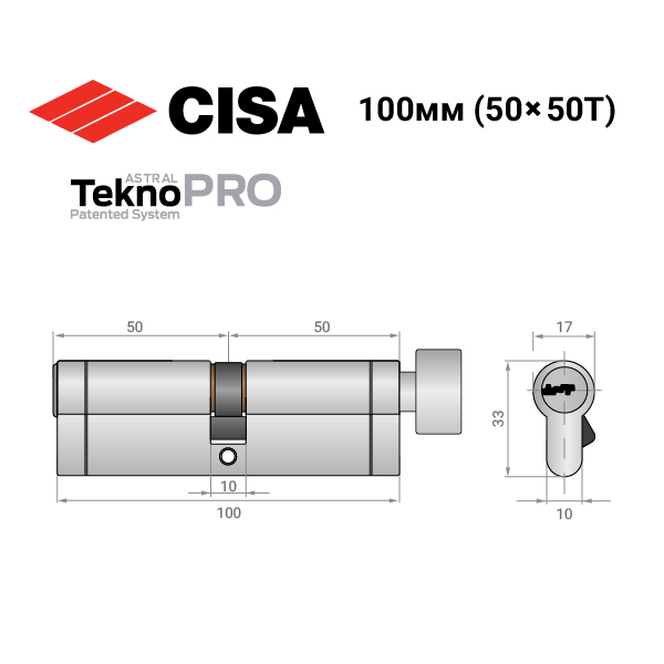 Описание Цилиндр CISA Astral Tekno PRO 100T (50*50T) никель матовый 3 ключа