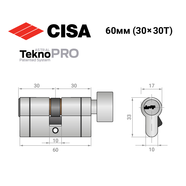 Описание Цилиндр CISA Astral Tekno PRO 60T (30*30T) никель матовый 3 ключа