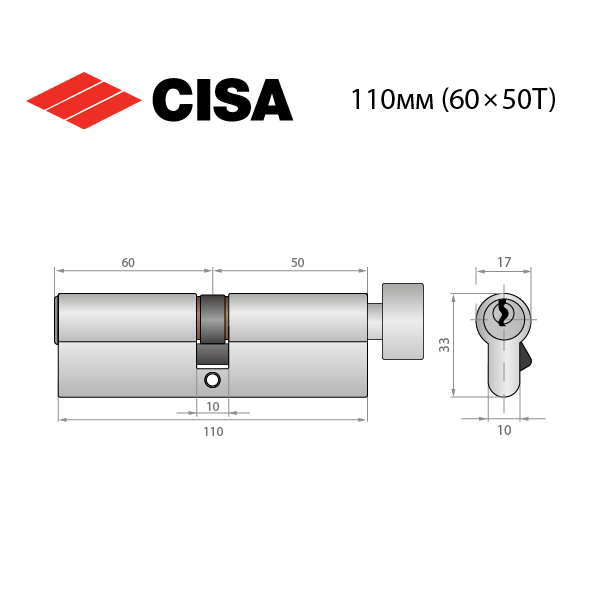 Описание Цилиндр CISA C2000 110T (60*50T) никель матовый 3 ключа