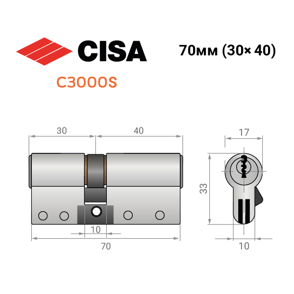 Купить цилиндр CISA C3000S 70 (30*40) никель матовый в розницу и оптом можно на нашем сайте.
