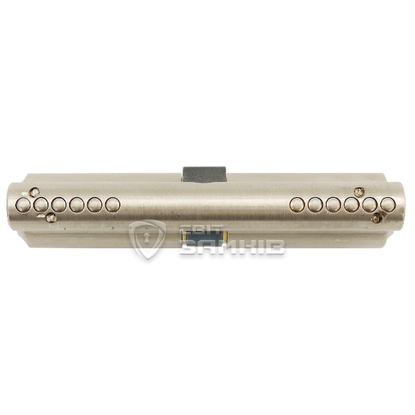 В корпусе цилиндра и плазе вмонтированы стальные закаленные стержни, они защищают от сверления или фрезерования. При попытке просверлить отверстие, сверло будет вести в сторону или оно сломается. Но мы все равно рекомендуем при установке на входной двери использовать врезную броненакладку, это усилит конструкцию и значительно усложнит любые манипуляции с цилиндром.