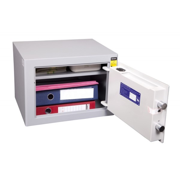Корпус и двери сейфа изготовлены из металла толщиной 3 и 4 мм соответственно. Вместе с ключевым замком STUV это создаст существенную преграду для злоумышленника. Запирание осуществляется толстыми вращающимися ригелями диаметром 25 мм. Они обеспечат практическую защиту от возможности их перепиливания. Петли в форме антисрезов имеют внутреннее исполнение, поэтому их сбить совершенно невозможно. В сером цвете отлично дополнит любое современное помещение.