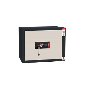 Корпус и двери сейфа изготовлены из металла толщиной 3 мм. Закрывается ключевым сувальдным замком. Запирание осуществляется вращающимися ригелями диаметром 16 мм. Они обеспечат практическую защиту от возможности их перепиливания. Петли имеют внутреннее исполнение. Они позволяют открыть двери сейфа на 90 градусов, не перекрывая при этом сам проем. В сочетании антрацитово-серого с кремово-белым цветом отлично дополнит любое современное помещение.