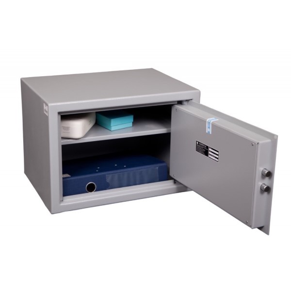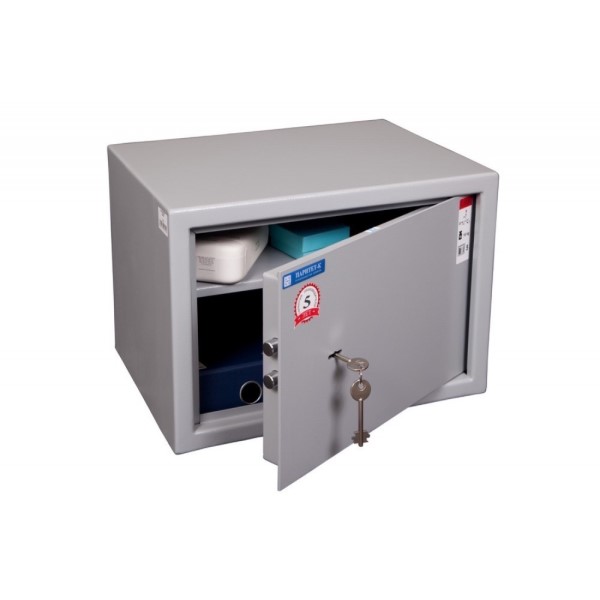 Корпус и двери сейфа изготовлены из металла толщиной 2 и 3 мм соответственно. Закрывается ключевым сувальдным замком. Запирание осуществляется вращающимися ригелями диаметром 16 мм. Они обеспечат практическую защиту от возможности их перепиливания. В сером цвете отлично дополнит любое современное помещение.