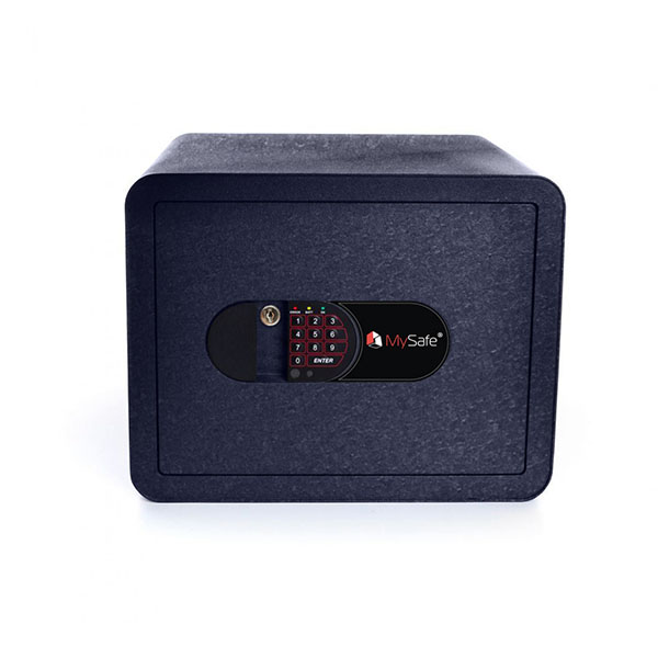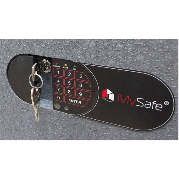 Корпус и дверь сейфа изготовлены из металла толщиной 2 и 4 мм соответственно. Закрывается электронным кодовым замком MySafe с аварийным ключом. То есть сейфом можно управлять либо вводом кодовой комбинации, либо аварийным ключом. Замыкание производится толстыми вращающимися ригелями диаметром 25 мм. Они обеспечат практическую защиту от возможности их перепиливания. Петли в форме антисрезов имеют внутреннее исполнение, поэтому их сбить совершенно невозможно. Для надежности крепления предусмотрены отверстия для анкерных болтов. Это позволит закрепить сейф к полу или стене.