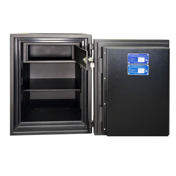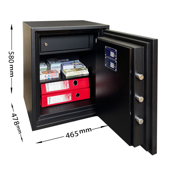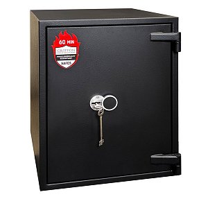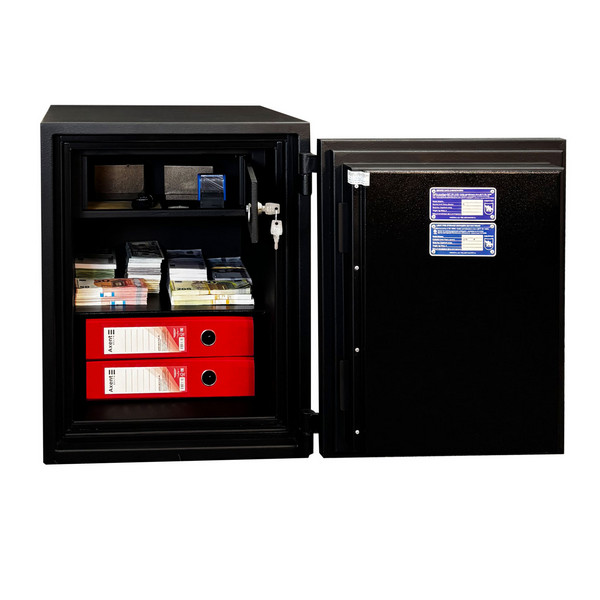 Толщина специального огнестойкого наполнения дверей и корпуса составляет 53 мм. Закрывается сейф ключевым сейфовым замком WITTKOPP (Германия). Это создаст существенный препятствие для злоумышленника. Замыкание производится ригельной системой. Толстые вращающиеся ригеля диаметром 25 мм обеспечат практическую защиту от возможности их перепиливания. Дополнительно со стороны петель есть антисрезы. Конструкция предусматривает специальные карманы для ригелей и антисрезов, которые обеспечивают плотное прилегание двери по всему периметру и повышают устойчивость сейфа к силовым методам взлома. Благодаря этому достигается класс взломостойкости S2 (по ДСТУ EN 1143-1). В черном цвете сейф отлично дополнит любое современное помещение.