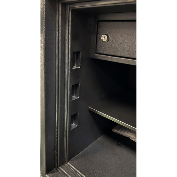 Внутреннее пространство имеет размеры: 474 мм по высоте, 359 мм по ширине и 308 мм по глубине. Габариты сейфа позволяют удобно размещать офисные папки типа "Корона", что делает модель практичным решением для хранения документации. Есть съемная полка, позволяющая разделить, например, документы и деньги. Ее можно легко снять, если необходимо хранить объемные предметы. Дополнительно у этой модели есть отдельный кассовый отдел (трейзер). Он захлопывается на ключ.