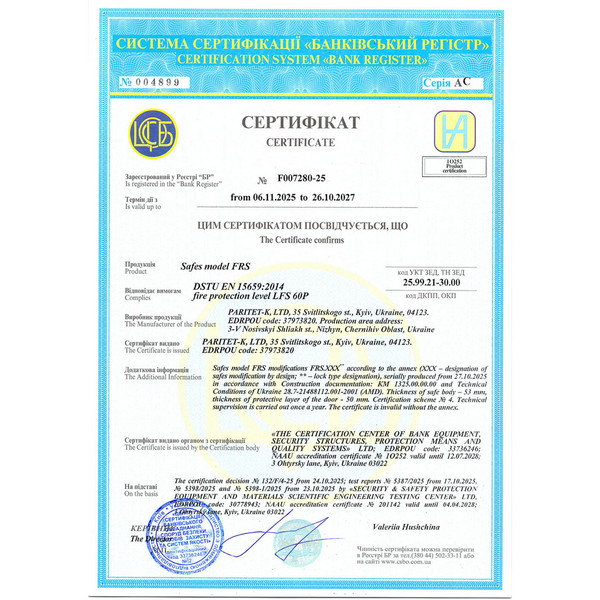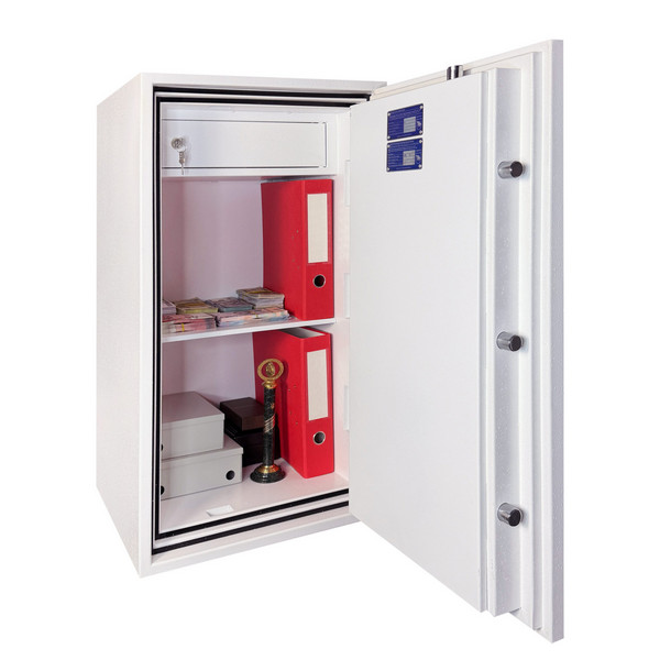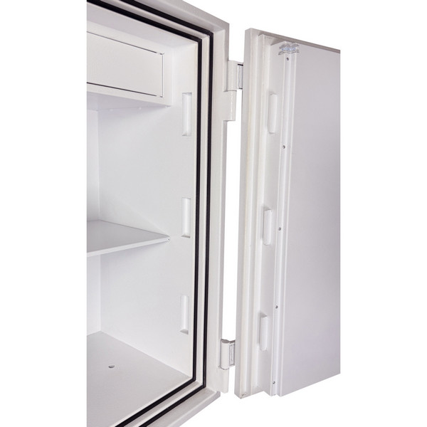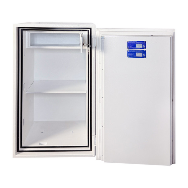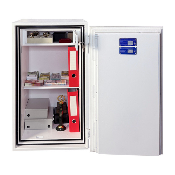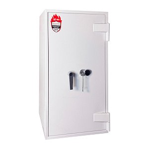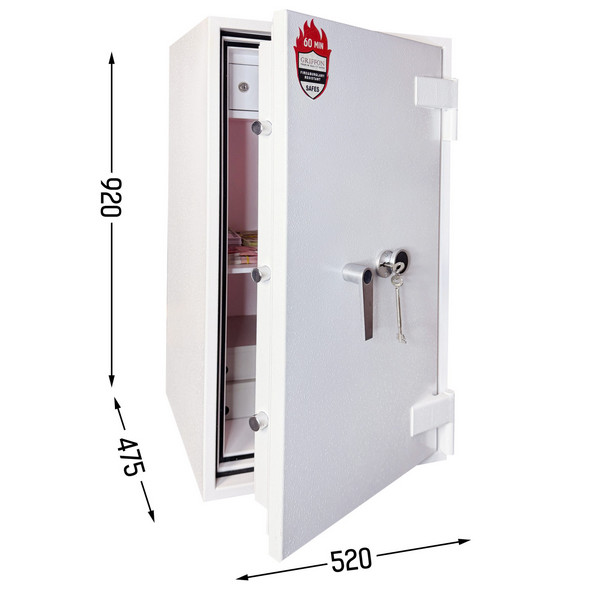 Толщина специального огнестойкого наполнения дверей и корпуса составляет 53 мм. Закрывается сейф ключевым сейфовым замком WITTKOPP (Германия). Это создаст существенный препятствие для злоумышленника. Замыкание производится ригельной системой. Толстые вращающиеся ригеля диаметром 25 мм обеспечат практическую защиту от возможности их перепиливания. Дополнительно со стороны петель есть антисрезы. Конструкция предусматривает специальные карманы для ригелей и антисрезов, которые обеспечивают плотное прилегание двери по всему периметру и повышают устойчивость сейфа к силовым методам взлома. Благодаря этому достигается класс взломостойкости S2 (по ДСТУ EN 14450). В белом цвете сейф отлично дополнит любое современное помещение.