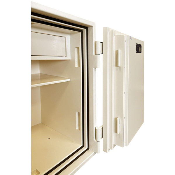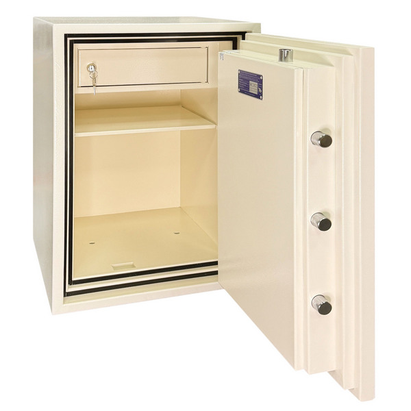 Толщина специального огнестойкого наполнения дверей и корпуса составляет 53 мм. Закрывается сейф электронным кодовым замком GRIFFON Q2Е. Сенсорный кодонабиратель с дисплеем обеспечивает быстрый ввод комбинаций, поддерживает два пользовательских кода и имеет функцию скрытого отображения символов на экране. Конструкция подразумевает легкую замену элементов питания без сложных манипуляций. Также есть наличие аварийного ключевого замка, позволяющего открыть сейф механическим ключом в случае необходимости. Это создаст существенную преграду для злоумышленника. Запирание осуществляется ригельной системой. Толстые вращающиеся ригеля диаметром 25 мм обеспечат практическую защиту от возможности их перепиливания. Дополнительно со стороны петель имеются антисрезы. В кремовом цвете сейф отлично дополнит любое современное помещение.