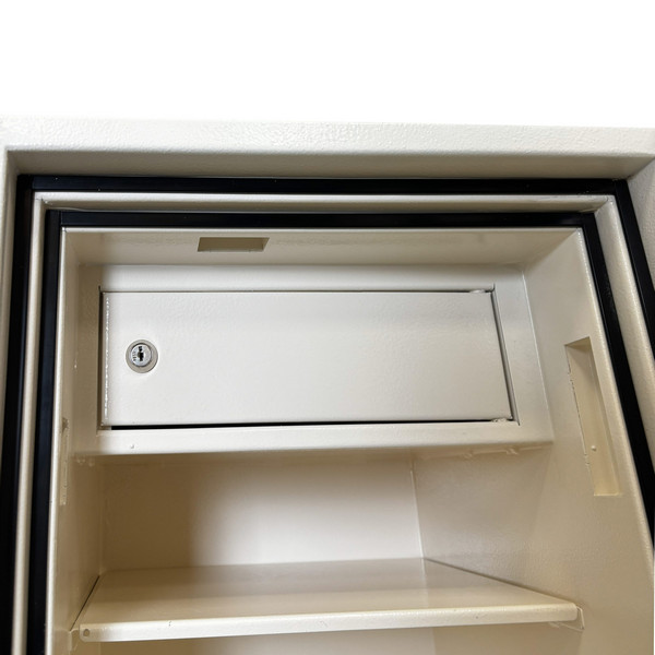 Внутреннее пространство имеет размеры: 581 мм по высоте, 364 мм по ширине и 308 мм по глубине. Есть съемная полка, которая позволит разделить, например, документы и деньги. Ее можно легко снять, если будет необходимость хранить объемные предметы. Дополнительно сейф оборудован кассовым отделом (трейзером). Он отдельно закрывается на ключ.