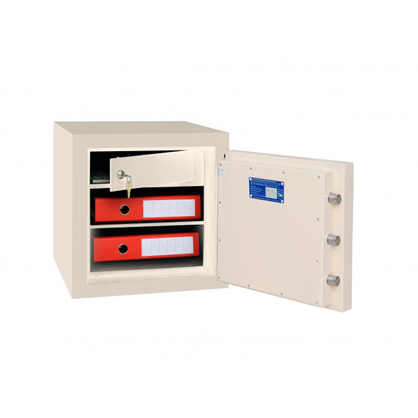 Толщина специального огнестойкого наполнения дверей и корпуса составляет 43 мм. Закрывается сейф ключевым замком STUV. Это создаст существенную преграду для злоумышленника. Запирание осуществляется ригельной системой. Толстые вращающиеся ригеля диаметром 25 мм обеспечат практическую защиту от возможности их перепиливания. Дополнительно со стороны петель имеются антисрезы. Благодаря этому достигается класс взломостойкости S2 (по ДСТУ EN 14450). В кремово-белом цвете сейф отлично дополнит любое современное помещение.