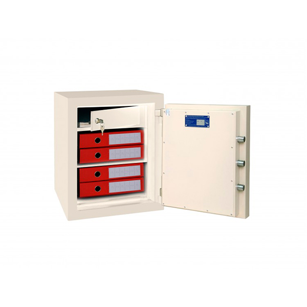 Толщина специального огнестойкого наполнения дверей и корпуса составляет 43 мм. Закрывается сейф ключевым замком STUV. Это создаст существенную преграду для злоумышленника. Запирание осуществляется ригельной системой. Толстые вращающиеся ригеля диаметром 25 мм обеспечат практическую защиту от возможности их перепиливания. Дополнительно со стороны петель имеются антисрезы. Благодаря этому достигается класс взломостойкости S2 (по ДСТУ EN 14450). В кремово-белом цвете сейф отлично дополнит любое современное помещение.
