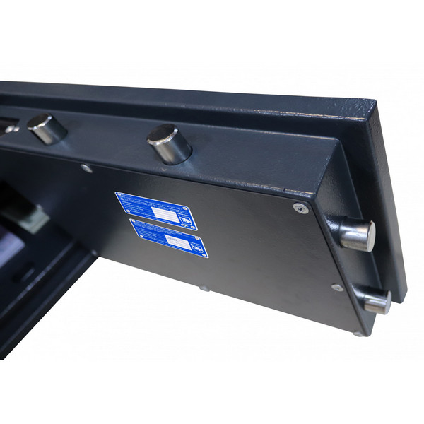 Сейф имеет трехстороннюю ригельную систему для запирания, что гарантирует надежную защиту. Дополнительно с помощью антисрезов со стороны петель защищает от злоумышленников. Шесть толстых вращающихся ригеля диаметром 25 мм обеспечивают практическую защиту от возможности их перепиливания. В сочетании с надежным электронным замком SMARTLOCK (Италия) сейф имеет значимый барьер для любого потенциального злоумышленника. Отверстия под анкерные винты (снизу сейфа) позволят легко установить и закрепить его к стене или полу.