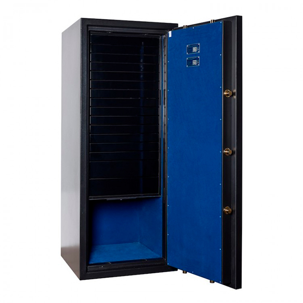 Корпус сейфа заполнен специальным фортификационным бетоном. Толщина защитного слоя составляет 40 мм. Закрывается ключевым сейфовым замком STUV и электронным кодовым замком M-LOCKS, что создаст существенную преграду для злоумышленника. Запирание осуществляется ригельной системой трехстороннего действия. Толстые вращающиеся ригеля диаметром 25 мм обеспечат практическую защиту от возможности их перепиливание. Дополнительно со стороны петель имеются антисрезы. В новом черном глянцевом цвете с золотыми элементами цвете сейф отлично дополнит любое современное помещение в темных тонах и покажет чувство стиля его владельца.