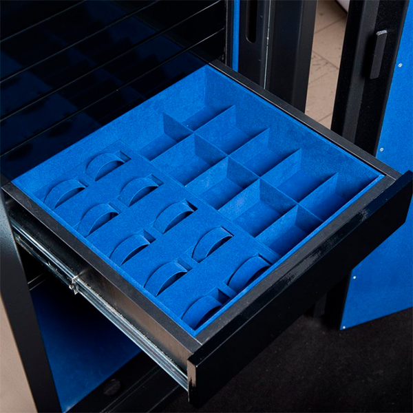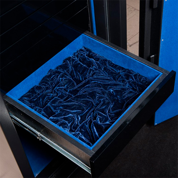 Внутреннее пространство имеет размеры: 1410 мм по высоте, 520 мм по ширине и 456 мм по глубине. Фишкой является наличие выдвижных ящиков для удобного хранения разного рода небольших украшений. Ниже есть отдел для хранения объемных вещей. Объем внутри сейфа украшенный приятным материалом. Именно поэтому будет идеальным для использования в ювелирных мастерских.