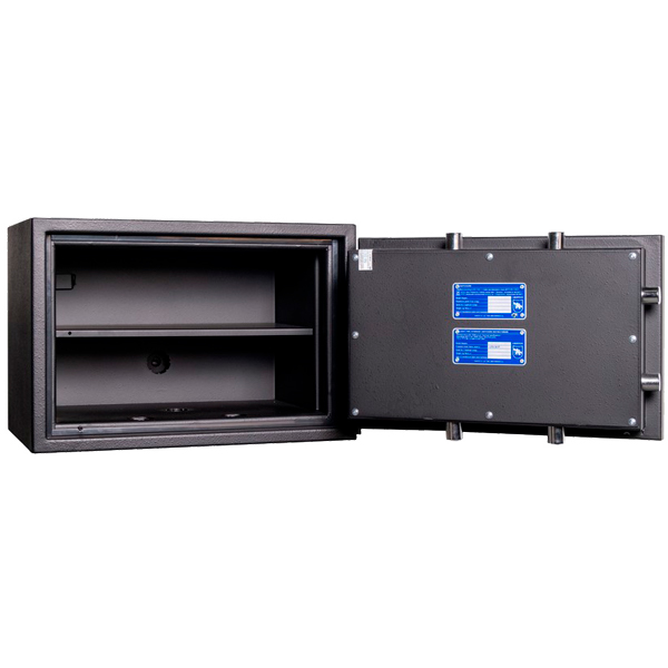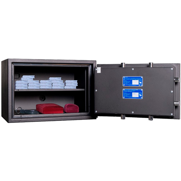 Сейф имеет трехстороннюю ригельную систему для запирания, что гарантирует надежную защиту. Дополнительная защита осуществляется с помощью антисрезов со стороны петель. Шесть толстых вращающихся ригеля диаметром 25 мм обеспечивают практическую защиту от возможности их перепиливания. Обладает сейфовым замком CARL WITTKOPP (Германия). С помощью отверстий под анкерные болты, сейф можно легко установить и закрепить к полу. Все его особенности станут значимым барьером для любого потенциального злоумышленника.