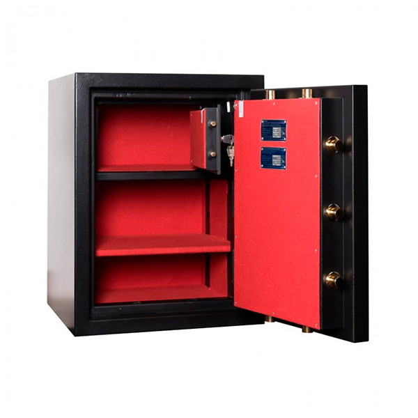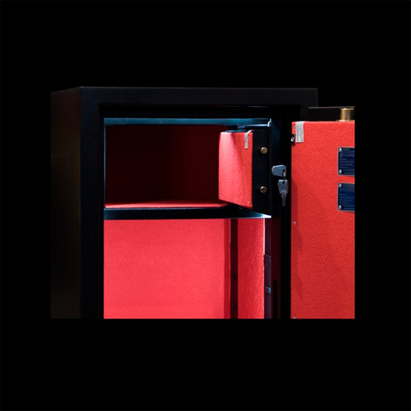 Внутреннее пространство имеет размеры 574 мм по высоте, 420 мм по ширине и 363 мм по глубине. Также есть полка, которая позволит разделить, например, документы и деньги. Ее можно легко снять, если будет необходимость хранить объемные предметы. Объем внутри сейфа украшенный приятным материалом и позволяет легко поместить обычные папки с документами формата А4 в любом положении. Дополнительно в этой модели есть отдельный кассовый отдел (трейзер).