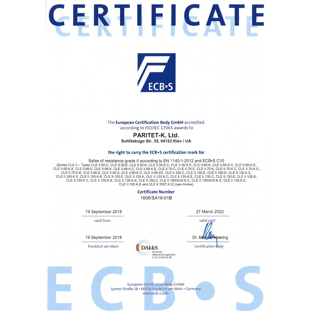 Украинский производитель ПАРИТЕТ-К является одним из лучших и самых прогрессивных в сфере проектирования и изготовления сейфов любой категории. Данная модель GRIFFON CLE.II.120.K.E относится к огневзломостойким. Она способна защищать ценности от взлома (II класс по EN 1143-1) и действия огня (класс LFS 30 P). Это означает, что во время пожара в течение 30 минут температура внутри сейфа не поднимется выше 170°C, чего достаточно для хранения бумажных документов. Довольно не малые габариты потребуют соответствующего места в помещении. Это нужно учитывать. Для надежности крепления внизу сейфа предусмотрены отверстия для анкерных болтов. Это позволит закрепить его к полу.