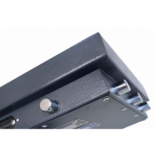 Корпус сейфа заполнен специальным фортификационным бетоном. Толщина защитного слоя составляет 55 мм. Вместе с ключевым сейфовым замком STUV это создаст существенную преграду и для злоумышленника. Запирание осуществляется ригельной системой трехстороннего действия. Толстые вращающиеся ригеля диаметром 25 мм обеспечат практическую защиту от возможности их перепиливания. Дополнительно со стороны петель является антисрезы. Удобства пользования добавляет эргономичная ручка. В темно-сером цвете с эффектом молотковой эмали сейф отлично дополнит любое современное здание да не будет привлекать излишнее внимание.