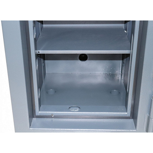 Внутреннее пространство имеет размеры: 390 мм по высоте, 350 мм по ширине и 312 мм по глубине. Есть полка, которая позволит разделить, например, документы и деньги. Ее можно легко снять, если будет необходимость хранить объемные предметы. Пространство внутри сейфа позволяет легко поместить обычные папки с документами формата А4 в любом положении.