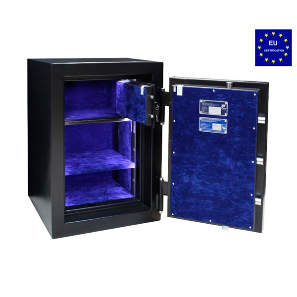 Корпус сейфа заполнен специальным фортификационным бетоном. Толщина защитного слоя составляет 55 мм. Вместе с электронным кодовым замком M-LOCKS это создаст существенную преграду и для злоумышленника. Он оснащен светодиодной подсветкой синего цвета. Запирание осуществляется ригельной системой трехстороннего действия. Толстые вращающиеся ригеля диаметром 25 мм обеспечат практическую защиту от возможности их перепиливания. Дополнительно со стороны петель является антисрезы. Удобства пользования добавляет эргономичная ручка. В новом черном цвете сейф особенно удачно впишется в любое современное помещение, дополнительно подчеркивая видение стиля владельца.