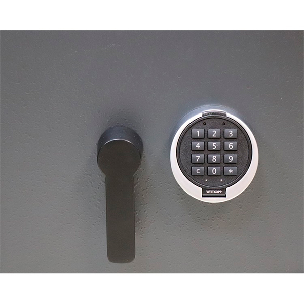 Корпус сейфа заполнен специальным фортификационным бетоном. Толщина защитного слоя составляет 55 мм. Закрывается сертифицированным электронным сейфовым замком Carl Wittkopp с возможностью аварийного открывания ключом со скрытым доступом к замку. В комплект входит два аварийных ключа. Запирание осуществляется ригельной системой трехстороннего действия. Толстые вращающиеся ригеля диаметром 25 мм обеспечат практическую защиту от возможности их перепиливания. Дополнительно со стороны петель является антисрезы. Удобства пользования добавляет эргономичная ручка. В темно-сером цвете с эффектом молотковой эмали сейф отлично дополнит любое современное здание да не будет привлекать излишнее внимание.
