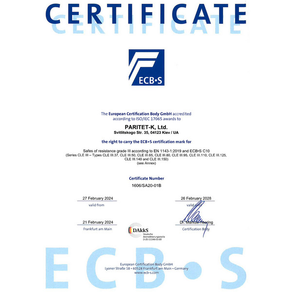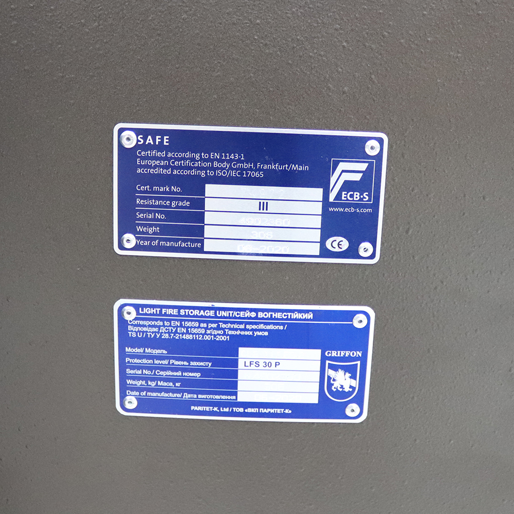 Украинский производитель ПАРИТЕТ-К является одним из лучших и самых прогрессивных в сфере проектирования и изготовления сейфов любой категории. Данная модель GRIFFON CLE III.65 E Combi относится к огневзломостойким. Она сертифицирована Европейским органом сертификации ECB-S по III классу сопротивления к взлому по стандарту EN 1143-1. Конструкция корпуса и дверей способна в течении получаса защищать ценности от воздействия высоких температур согласно классу LFS 30P. Для надежности крепления предусмотрены отверстия для анкерных болтов. Это позволит закрепить его к полу.