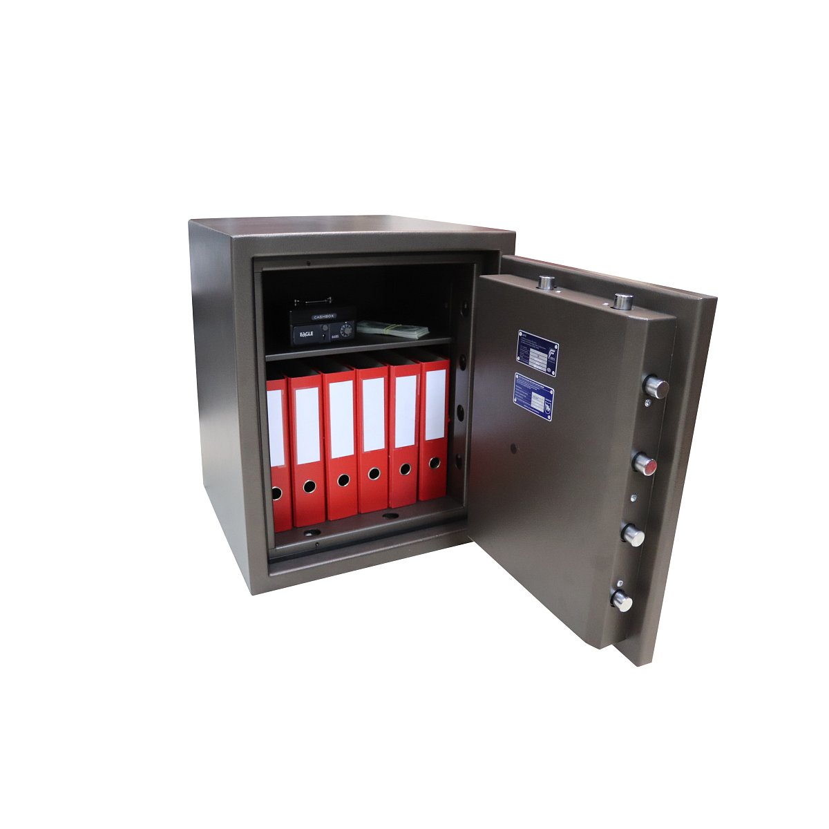 Внутреннее пространство имеет размеры 550 мм по высоте, 450 мм по ширине и 390 мм по глубине. Есть 2 полки, которые позволят разделить, например, документы и деньги. Их можно легко снять, если будет необходимость хранить объемные предметы. Пространство внутри сейфа позволяет легко поместить обычные папки с документами формата А4 в несколько рядов.