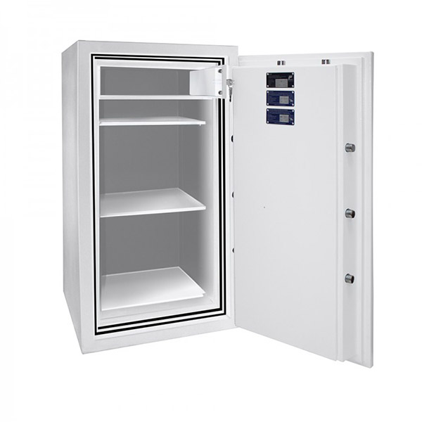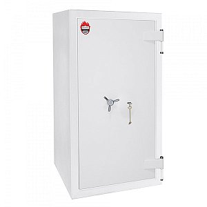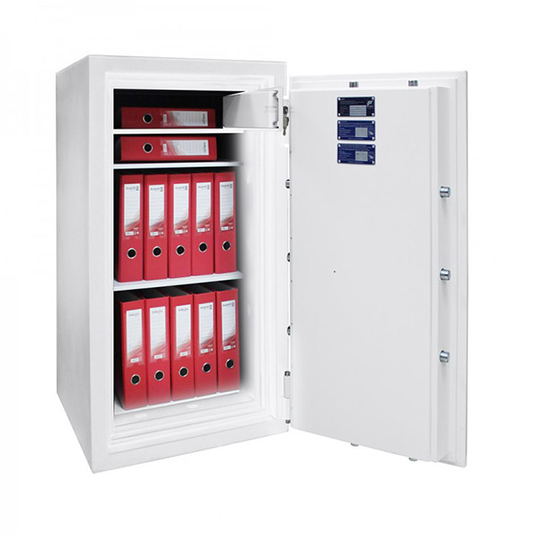 Корпус и двери сейфа заполнены специальным огнестойким бетоном. Толщина защитного слоя составляет 72 мм. Вместе с ключевым сейфовым замком STUV это создаст существенную преграду для злоумышленника. Запирание осуществляется ригельной системой четырехсторонней действия. Толстые вращающиеся ригеля диаметром 25 мм обеспечат практическую защиту от возможности их перепиливание. В белом цвете сейф отлично дополнит любое современное здание и не будет выделяться.