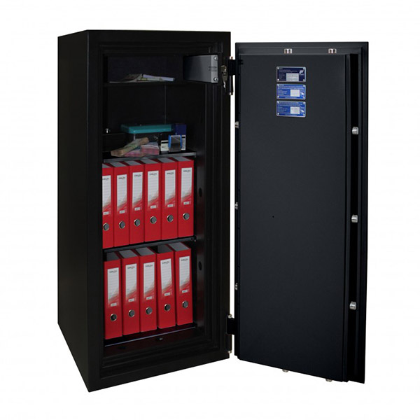 Внутреннее пространство имеет размеры: 1166 мм по высоте, 456 мм по ширине и 388 мм по глубине. Также есть 2 полки, которые позволят разделить, например, документы и деньги. Их можно легко снять, если будет необходимость хранить объемные предметы. Пространство внутри сейфа позволяет легко поместить обычные папки с документами формата А4 в любом положении в 3 ряда. Дополнительно в этой модели есть отдельный кассовый отдел (трейзер).