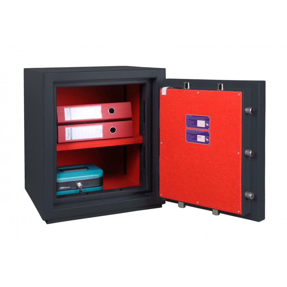 Корпус сейфа заполнен специальным фортификационным бетоном. Толщина защитного слоя составляет 40 мм. Вместе с электронным кодовым замком M-LOCKS или STUV SWINGLOX это создаст существенную преграду для злоумышленника. Запирание осуществляется ригельной системой трехстороннего действия. Толстые вращающиеся ригеля диаметром 25 мм обеспечат практическую защиту от возможности их перепиливания. Дополнительно со стороны петель является антисрезы. В темно-сером цвете с эффектом молотковой эмали сейф отлично дополнит любое современное помещение в темных тонах но не будет выделяться.