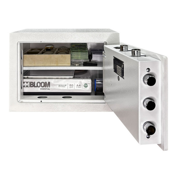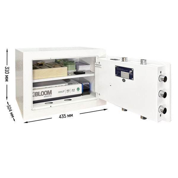 Стенки корпуса данного сейфа заполнены бетоном фортификационным толщиной 25 мм. Дверь изготовлена из металла толщиной 10 мм. Стальные легированные пластины оградят от высверливания и выбивания замков и ригелей. Вместе с электронным сейфовым замком M-LOCKS (Нидерланды) это создаст существенную преграду и злоумышленнику. Замыкание производится ригельной системой трехстороннего действия. Толстые вращающиеся ригеля диаметром 25 мм обеспечат практическую защиту от возможности их перепиливания. Дополнительно со стороны петель есть антисрезы. Удобство пользования добавляет эргономичная ручка. В белом сейф отлично дополнит любое современное помещение и не будет привлекать лишнее внимание.