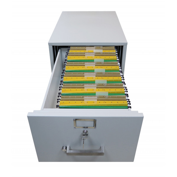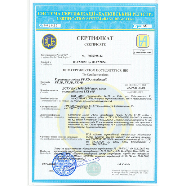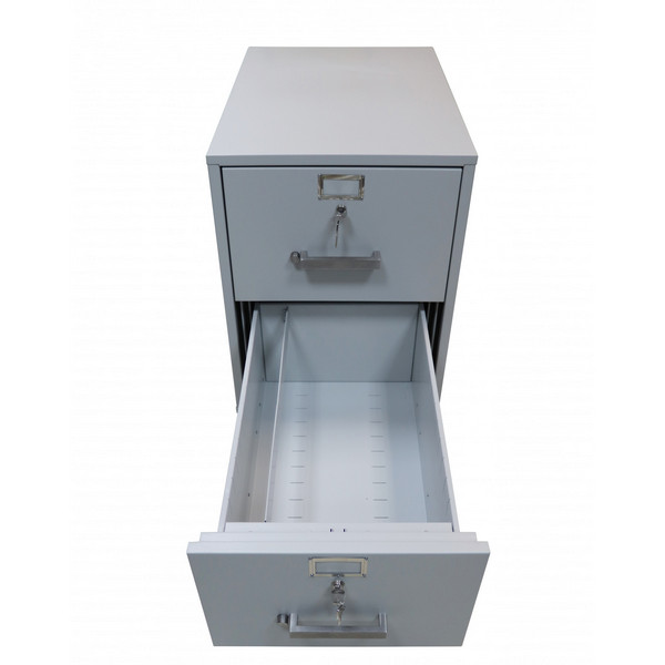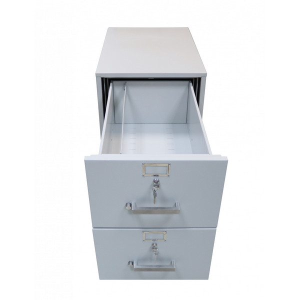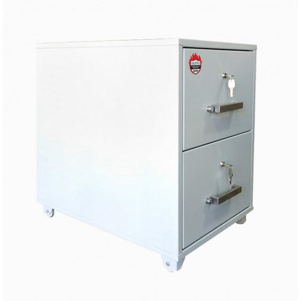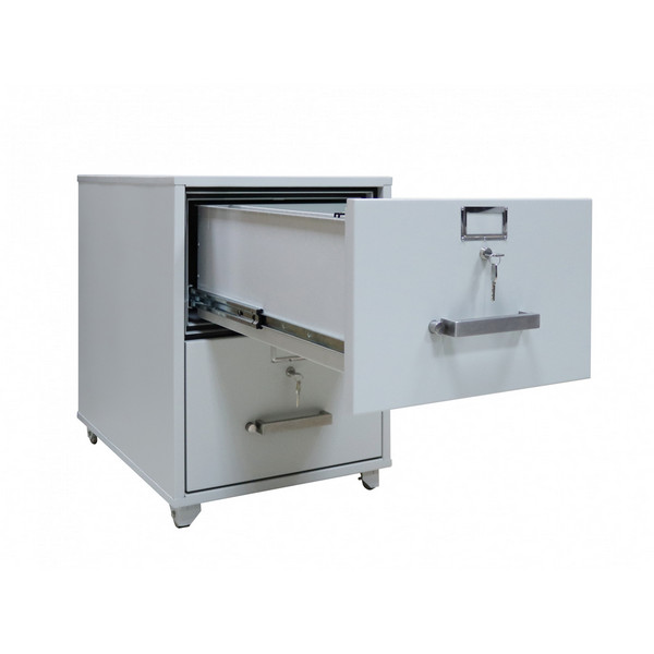 Данная модель имеет 2 ящика, каждый из которых закрывается на ключ. Система запирания каждого из них двусторонняя ригельная: один ригель приводится в движение кнопкой, а второй – замком. Поэтому чтобы открыть картотеку, нужно повернуть ключ и нажать на кнопку. Для того, чтобы удобно перемещать картотеку снизу ящиков есть четыре колеса. Имеет сертификат класса огнестойкости LFS60P по ДСТУ EN 15659. Это означает, что при пожаре продолжительностью до 60 минут содержимое картотеки останется целым и невредимым. Для хранения ценных документов эта особенность является очень важной.