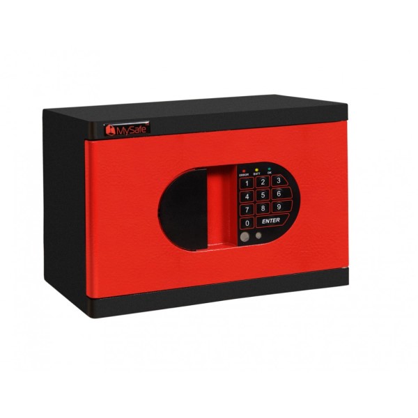 Корпус и двери сейфа изготовлены из металла толщиной 2 мм. Закрывается электронным кодовым замком MySafe. Запирание осуществляется толстыми вращающимися ригелями диаметром 25 мм. Они обеспечат практическую защиту от возможности их перепиливания. Петли в форме антисрезов имеют внутреннее исполнение, поэтому их сбить совершенно невозможно. В сочетании черного и красного цвета отлично дополнит любое современное помещение.