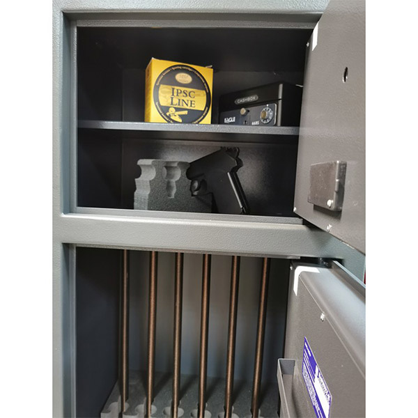 Внутреннее пространство имеет размеры: 304-1390 мм по высоте, 426 мм по ширине и 252 мм по глубине. Главной его фишкой является наличие двух отделов. Верхний предназначен для хранения негабаритных документов или ценностей. Имеет полку, которая помогает разделить общий объем на 2 части. Главный нижний отдел в свою очередь включает два передвижных ложемента, которые можно размещать в удобном для себя положении. Максимальное количество единиц оружия, которое там можно разместить - 7. На нижних дверях сейфа дополнительно присутствуют два кармана для хранения патронов, средств ухода за оружием и держатель.