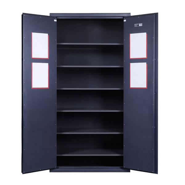 Корпус и двери сейфа изготовлены из металла толщиной 3 и 6 мм соответственно. Шкаф закрывается двумя ключевыми замками STUV. Запирание осуществляется ригельной системой четырехсторонней действия. Толстые вращающиеся ригеля диаметром 25 мм обеспечат практическую защиту от возможности их перепиливания. В темно-сером цвете с эффектом молотковой эмали сейф отлично дополнит любое современное здание и не будет выделяться.