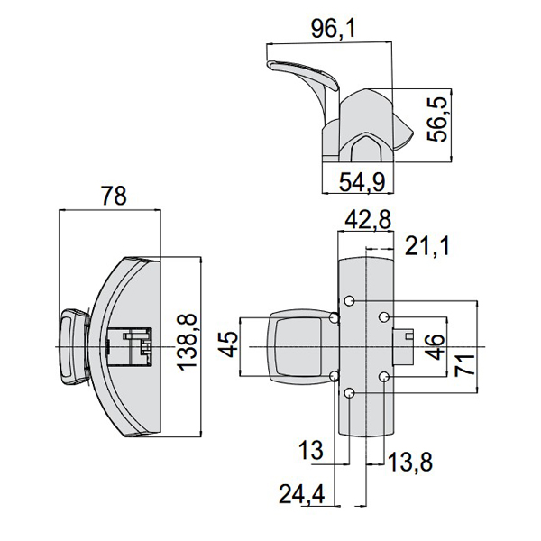 Размер механизма с язычком – 138,8х42,8х91,1 мм.