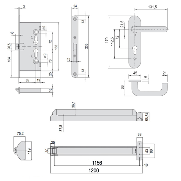 • Размер механизма антипаники – 119х38х56,54 мм.